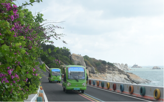 漫步湄洲岛主干道,映入眼帘的是一派绿色出行的场景——往来穿梭的公交与网约车均为新能源车辆,便捷的招手停车辆是电瓶车,游客们则悠闲地骑着共享自行车或电单车欣赏沿路风光。“纯电动公交车行驶平稳、没有尾气、噪音也小,让环岛观光体验更加舒适惬意。”前来旅游的吴先生赞叹道。