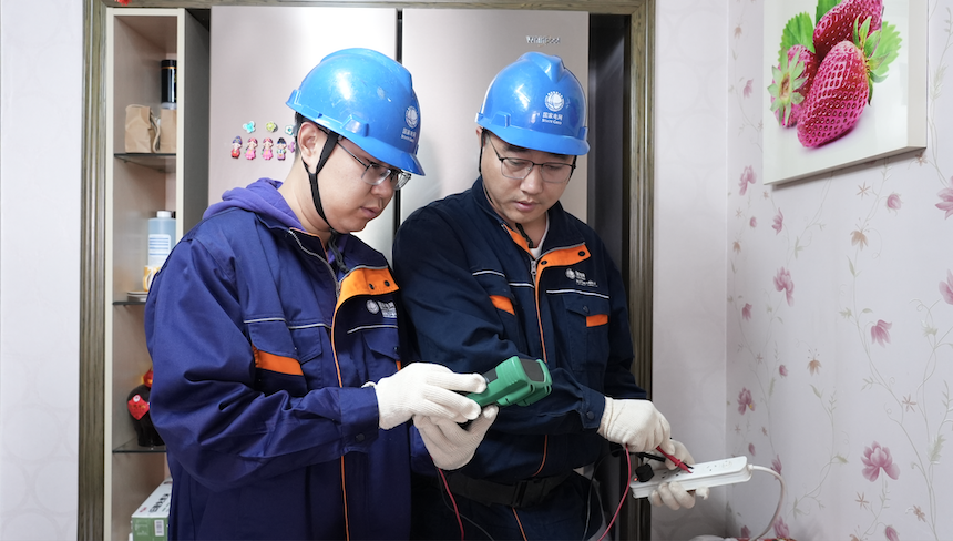 国网沈阳供电公司技术人员帮助居民客户家中排查用电安全隐患。