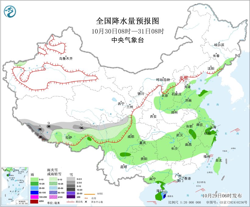 全国降水量预报图(10月29日08时-30日08时)。图片来源:中央气象台网站