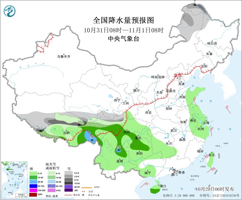 10月31日08时至11月1日08时,内蒙古东北部、黑龙江西北部、西藏北部和南部、青海南部、川西高原北部等地部分地区有小到中雪或雨夹雪,局地有大到暴雪(10~13毫米)。西藏东南部、江淮东部、江南东北部和西部、西南地区大部及广西西部和南部、海南岛、台湾岛大部等地部分地区有小到中雨,其中,西藏东南部、四川南部等地部分地区有大雨(25~40毫米)。内蒙古中东部等地部分地区有4~5级风;黄海大部海域、东海大部海域、台湾以东洋面、台湾海峡、巴士海峡、北部湾、南海北部海域将有5~6级、阵风7~8级的大风。