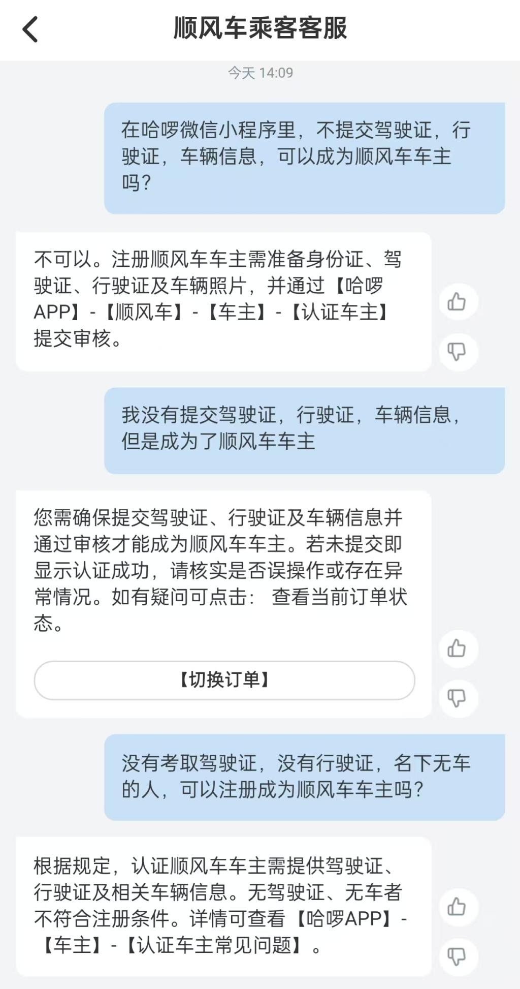 但哈啰顺风车客服的回复却和记者实测的完全相反。10月26日,记者通过哈啰微信小程序中的客服功能,咨询不提交驾驶证、行驶证和车辆信息,能注册成为顺风车车主吗?对方回复:不可以。注册顺风车车主需准备身份证、驾驶证、行驶证及车辆照片,并通过【哈啰APP】-【顺风车】-【车主】-【认证车主】提交审核;需确保提交驾驶证、行驶证及车辆信息并通过审核才能成为顺风车车主。若未提交即显示认证成功,请核实是否误操作或存在异常情况。如有疑问可点击:查看当前订单状态。