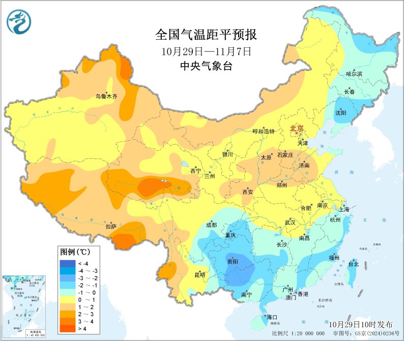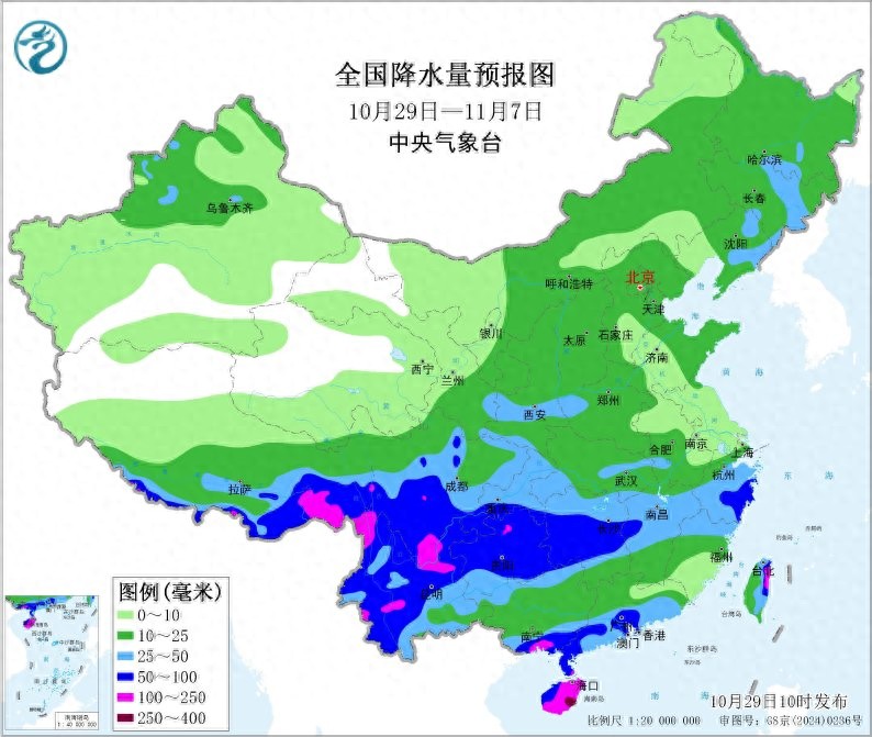 未来10天(10月29日至11月7日),西南地区大部、湖北南部、江南西部和北部、华南南部和西部、台湾岛及西藏东部和南部等地累计降水量有30~60毫米,其中四川南部、湖南、贵州、云南、西藏东南部及华南南部沿海、台湾岛等地的部分地区有70~90毫米,四川南部、云南西部和北部、西藏东南部、海南岛、台湾岛东部的部分地区有100~180毫米,海南岛东部局地超过250毫米;新疆西北部、甘肃南部、陕西、华北西部和北部、内蒙古东部、东北地区累计降水量有15~25毫米,局地40毫米左右。上述大部地区降水量较常年同期偏多4~8成,部分地区偏多1倍以上。