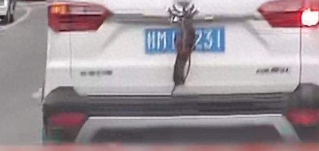 近日,有网友在某短视频平台上传了一段视频,反映一辆白色SUV小车在国道210线南丹县城关镇拉所路段行驶时,车后窗雨刮器上悬挂着两只老鼠,部分车牌被鼠身遮挡。