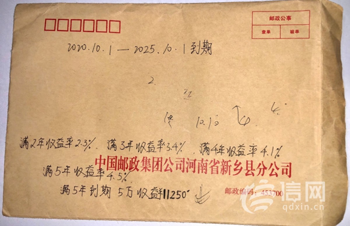 信网/信号新闻10月27日讯“满5年到期5万收益11250。”这是中国邮政储蓄银行新乡县翟坡镇营业所内,一名工作人员在邮储银行的信封上,给一位老人的手写承诺。老人本是想定期存款,“在银行里被忽悠着买了保险。买之前他们反复承诺利息高,能保4.5%的年收益,结果到期连3.2%都不到。”近日,河南新乡市民李女士向信号新闻(热线0532-80889431)反映了她母亲的遭遇。