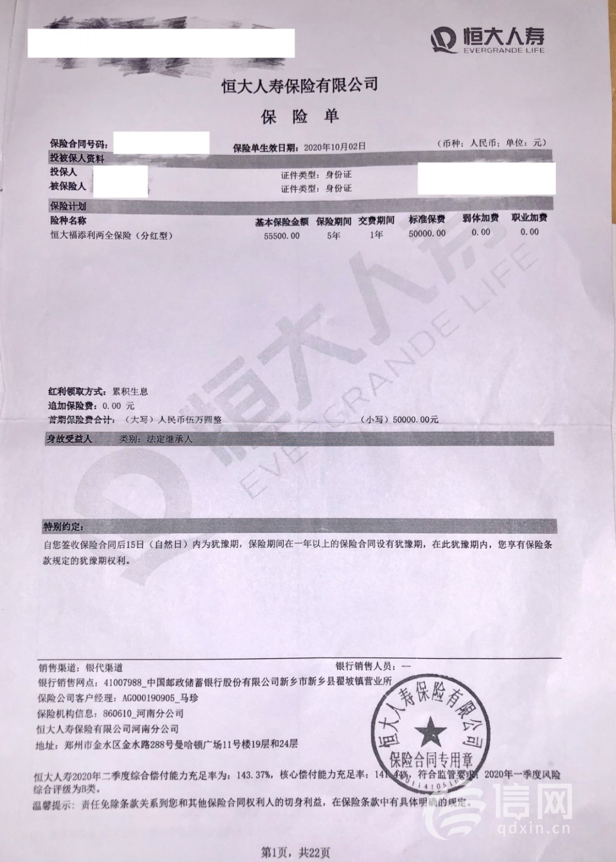 2020年10月,李女士的母亲来到中国邮政储蓄银行新乡县翟坡镇营业所办理定期存款业务。李女士的母亲告诉信号新闻,当自己来到银行询问定期存款事宜时,被自称是银行工作人员的一个人,将她带到银行内一个包间,并向其推荐了一款由中国邮政储蓄银行代售的恒大福添利两全保险(分红型)。“一直在推荐,说有个‘比定期利率高得多’的保险,存5年利息至少能到年息4.5%,比普通定期利息高得多,这名工作人员从始至终没有进行任何的风险提示。”李女士说。