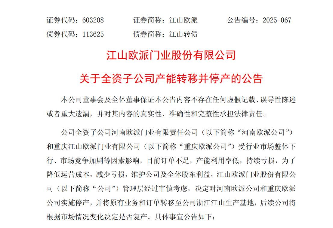 10月28日,江山欧派发布公告称,受行业市场整体下行、市场竞争加剧等因素影响,目前订单不足,产能利用率低,持续亏损,为了降低运营成本,减少亏损,决定对全资子公司河南欧派公司和重庆欧派公司实施停产,并将原有业务和订单转移至公司浙江江山生产基地,后续公司将根据市场情况变化决定是否复产。