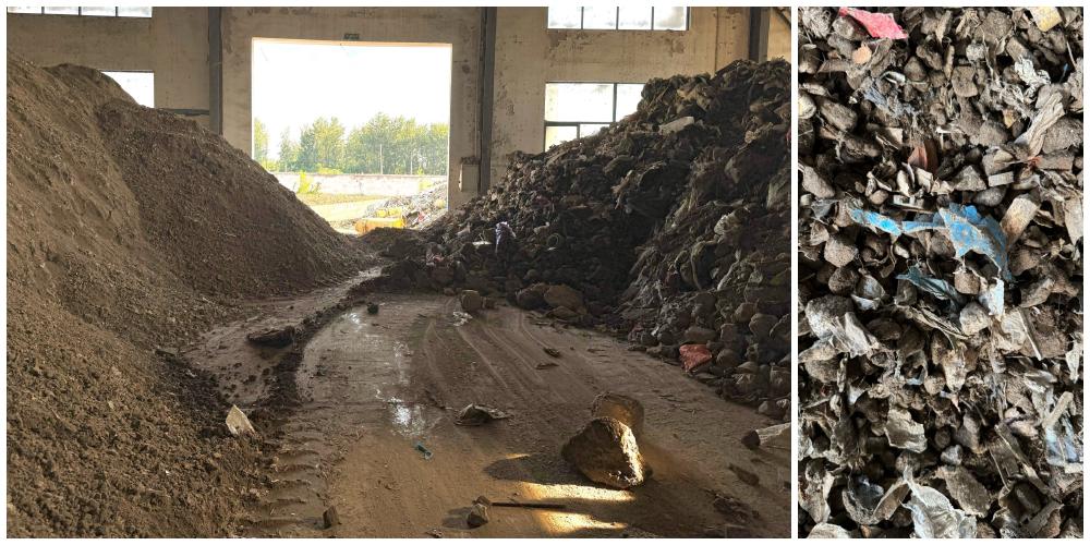 记者进入该厂房后,发现前述车辆仍在装料。现场堆放着大量生活垃圾、碎石等废料。涉事司机指着一处渣土堆,称是给沃隆送的料。土堆里满是石块和塑料卡片,还混有硬化纸巾等生活用品,“这不是建筑垃圾,是以前被埋,现在弄上来的,带点土。”司机称,沃隆拉回去后,一筛成细土就可以使用。