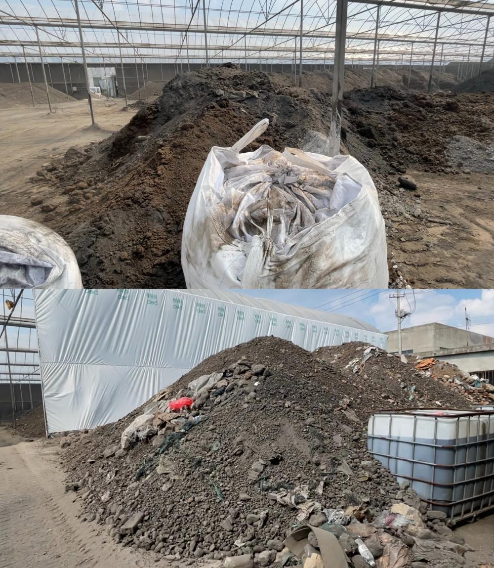 影子调查队在现场未见到任何无害化处置设备。厂里的简易大棚,堆放着各种棕黄、发黑的“营养土”原料、碎石;大棚后的一块空地,与旁边钢渣废料处理厂的空地相连,有挂车正在不远处卸炉渣;空地上同样露天堆着大量原料,未进行任何遮挡。