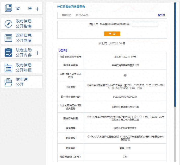 对此,国家外汇管理局北京市分局根据《中华人民共和国外汇管理条例》(中华人民共和国国务院令第532号)第四十八条第四项,对中海石油财务公司罚款人民币2.5万元。