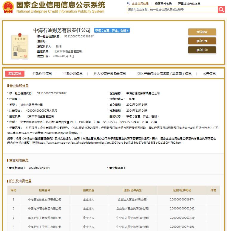 国家企业信用信息公示系统显示,中海石油财务有限责任公司成立于2002年,注册资本400000万元人民币,法定代表人杨楠,大股东为中国海洋石油集团有限公司。