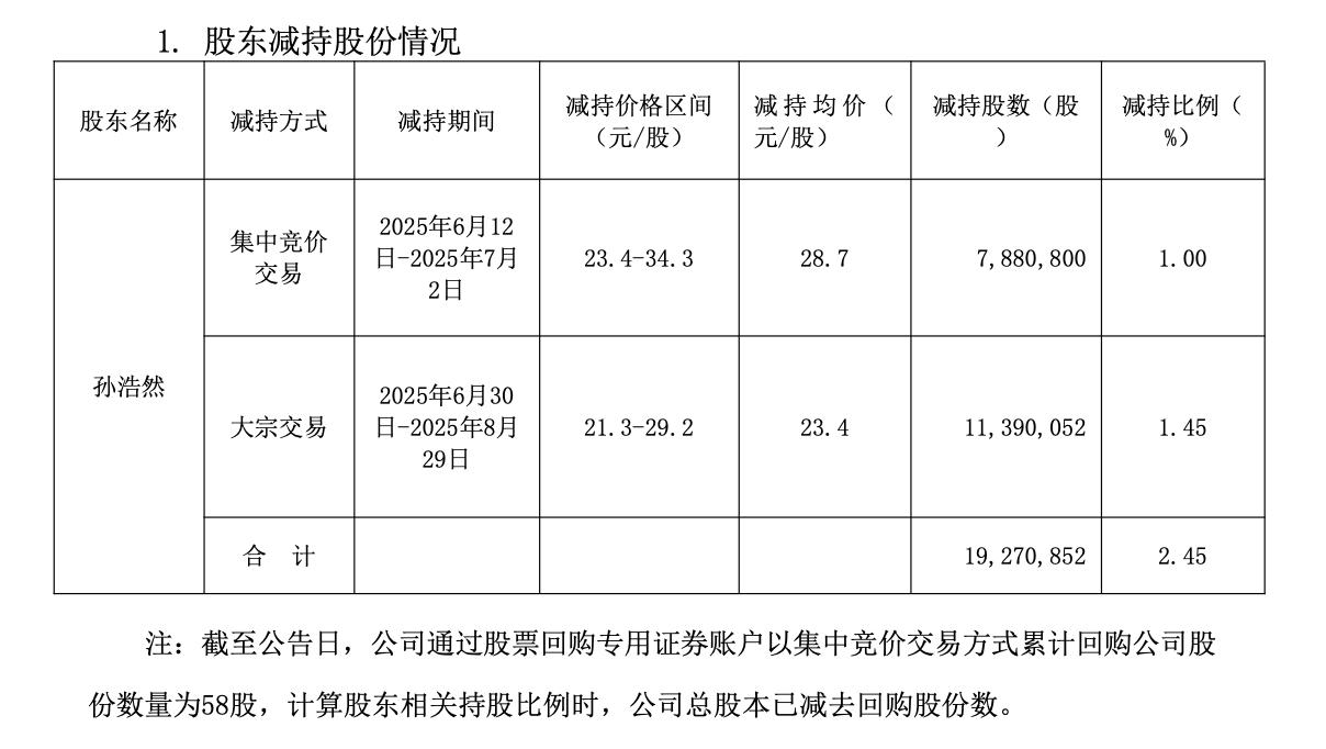 根据最新公告,孙浩然本次减持计划已实施完毕,减持实施情况如下:通过集中竞价交易的减持股数为7,880,800股,减持比例1%,减持均价为28.7元/股;通过大宗交易的减持股数为11,390,052股,减持比例1.45%,减持均价为23.4元/股。根据公告,本次减持孙浩然累计套现金额约4.93亿元。