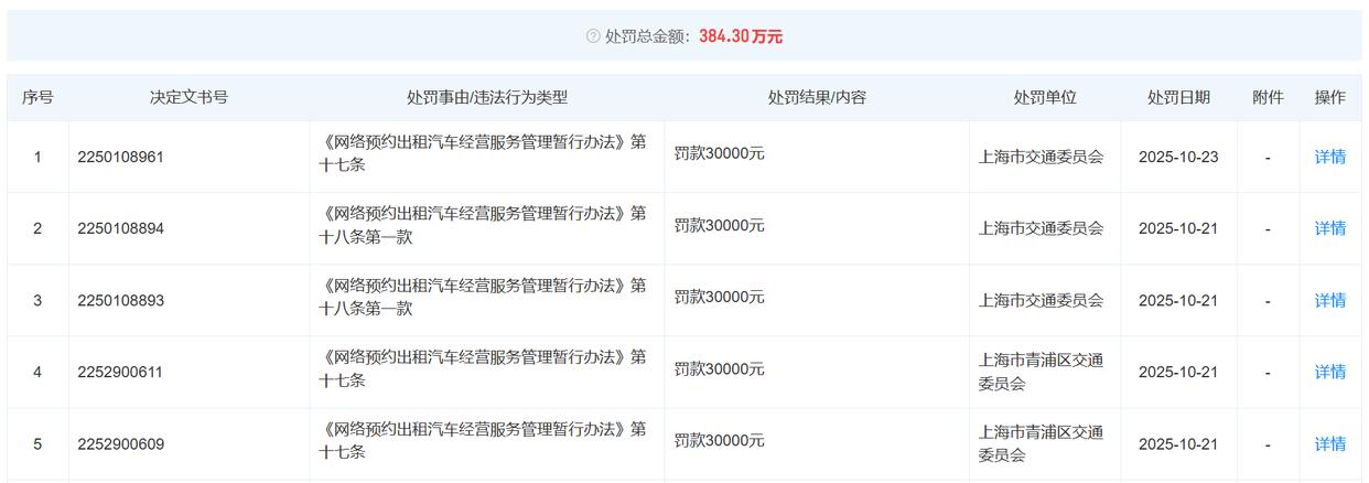 天眼查网站显示,截至10月29日,与享道出行相关的行政处罚共149条,处罚总金额为384.3万元。