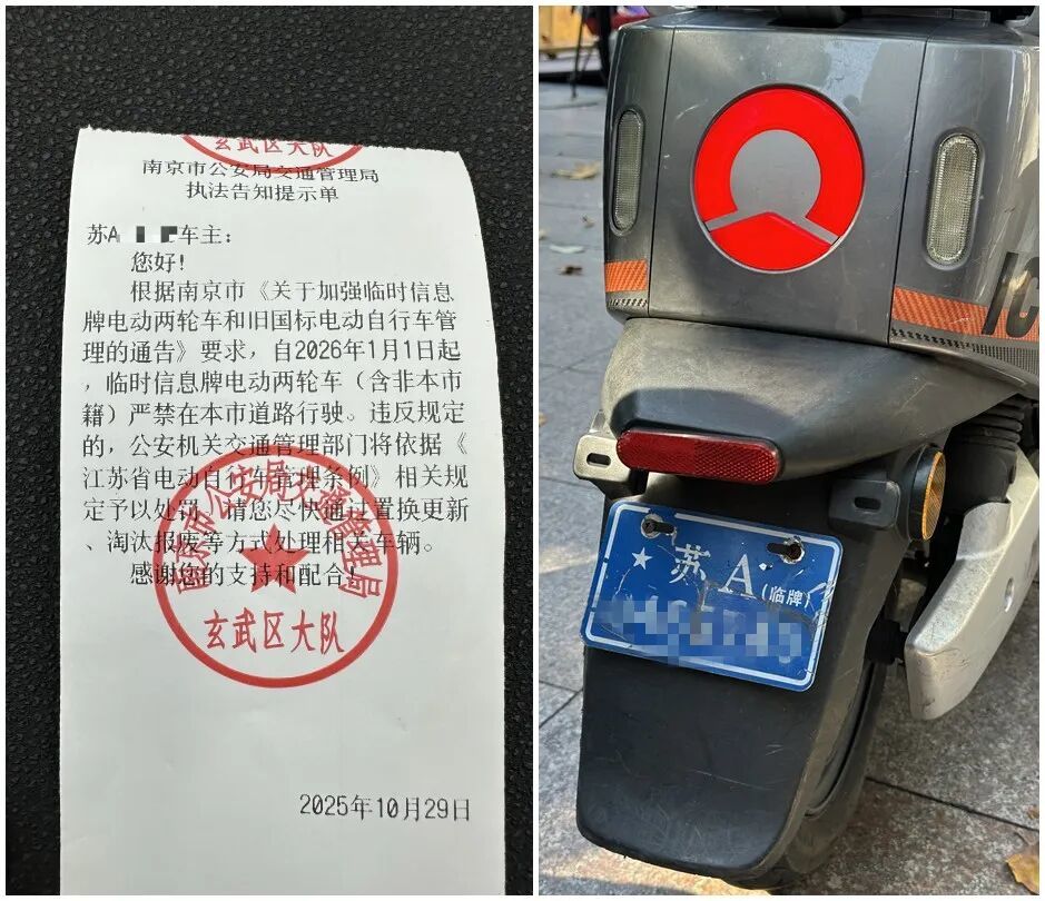 “我这‘蓝牌’电动车还剩两个多月啦?”他一边看单据一边问道。交警解释,去年10月南京市政府多部门联合发布《关于加强临时信息牌电动两轮车和旧国标电动自行车管理的通告》,规定自2026年1月1日起,凡悬挂临时信息牌(含非本市籍)的电动两轮车禁止在南京市范围内道路上行驶。