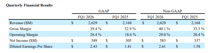 分析师指出,最新财报显示这些基本面依然稳固。具体而言,最新财报显示,当季调整后每股收益为2.61美元,高于分析师普遍预期的2.40美元。营收达26.3亿美元,同比增长21%,同样超过市场预估的25.5亿美元。