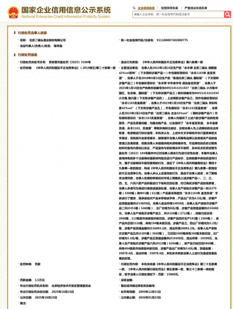 国家企业信用信息公示系统网站显示,近日,北京二锅头酒业股份有限公司因违反反不正当竞争法,被北京经济技术开发区管理委员会罚款1.5万元。