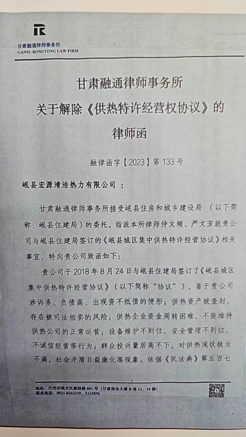 这份关于解除《供热特许经营协议》的律师函,是甘肃融通律师事务所受岷县住建局委托出具的。律师函称,鉴于宏源公司涉诉多、负债高、出现资不抵债的情形;群众投诉量居高不下,对供热现状极为不满,社会矛盾日益激化等,依据民法典、住建部等相关法律规定,公司已违反相关法律法规规定并构成违约……违法、违约行为已严重影响岷县供热保障,危及公共利益,且会导致《特许经营协议》的合同目的不能实现。