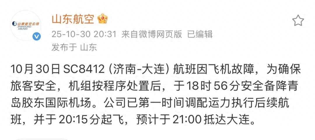 10月30日SC8412(济南-大连)航班因飞机故障,为确保旅客安全,机组按程序处置后,于18时56分安全备降青岛胶东国际机场。公司已第一时间调配运力执行后续航班,并于20:15分起飞,预计于21:00抵达大连。