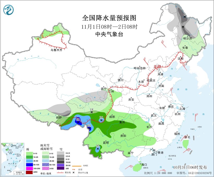 11月1日08时至2日08时,内蒙古东北部、黑龙江中西部和南部、吉林、西藏东北部和南部、青海南部、川西高原北部等地部分地区有小到中雪或雨夹雪,其中,黑龙江西部等地局地有大雪(5~8毫米)。西藏南部和东部、四川中西部和南部、贵州北部、云南北部和西南部等地部分地区有中到大雨,其中,西藏东南部、云南西北部等地部分地区有暴雨(50~60毫米)。内蒙古中东部、黑龙江西北部、川西高原北部等地部分地区有4~6级风,新疆北部部分地区有6~7级风;渤海、渤海海峡、黄海北部和中部海域、台湾海峡、巴士海峡、南海东北部海域将有5~7级、阵风8级的风。