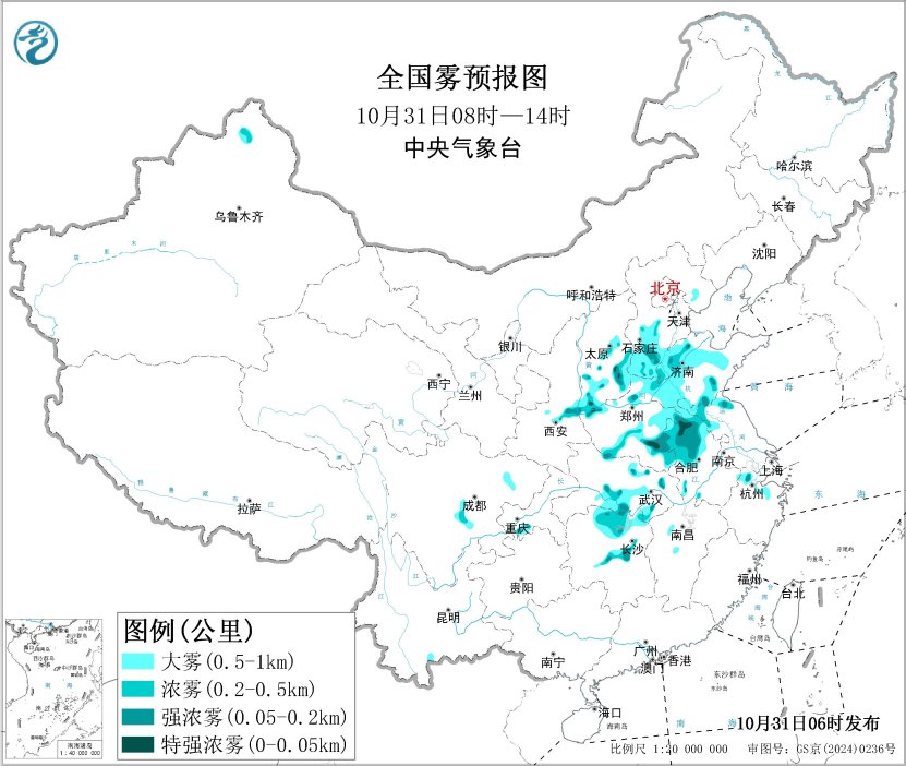 10月31日早晨至上午,河北中南部、河南北部和东部、山东中西部、山西中南部、陕西关中、安徽中北部、江苏北部、湖北中部、湖南北部、四川盆地西部等地有大雾,其中,河北南部、河南东部、山东西北部、安徽中北部、山西中南部、陕西关中东部、湖南北部等地的部分地区有能见度不足500米的浓雾,局地有能见度不足200米的强浓雾。中央气象台10月31日06时继续发布大雾黄色预警。