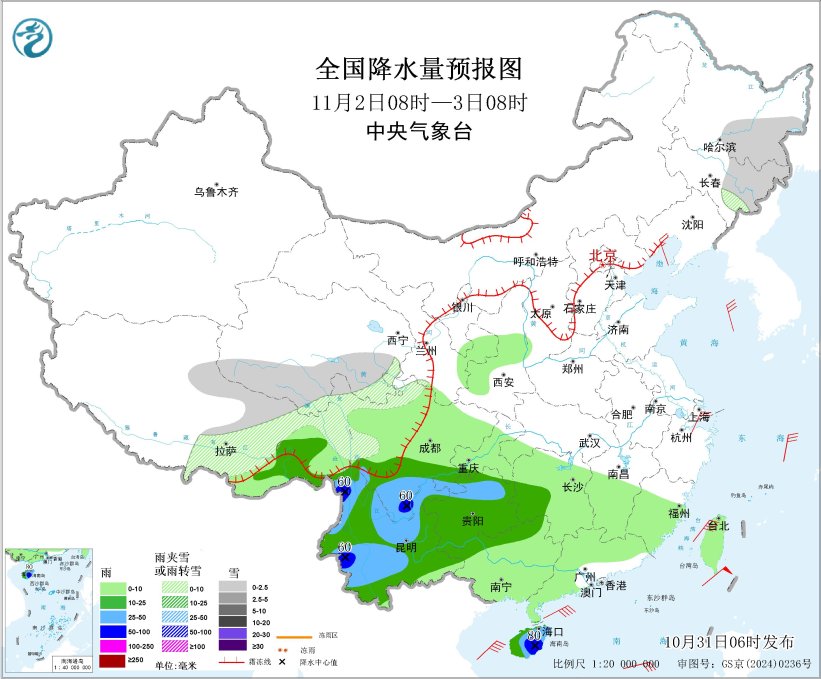 11月2日08时至3日08时,黑龙江东南部、吉林东部、西藏东部和南部、青海南部和西部、川西高原等地部分地区有小雪或雨夹雪。西藏东南部、四川南部、贵州、云南、广西北部、海南岛等地部分地区有中到大雨,其中,四川南部、云南西部、海南岛中东部等地部分地区有暴雨(50~80毫米)。内蒙古中部、辽东半岛等地部分地区有5~6级风;台湾海峡、巴士海峡将有6~8级、阵风9级的风,黄海北部和中部海域、东海海域、台湾以东洋面、北部湾、琼州海峡、南海北部和中东部海域将有5~7级、阵风8级的风,渤海、南海中西部海域将有5~6级、阵风7级的风。