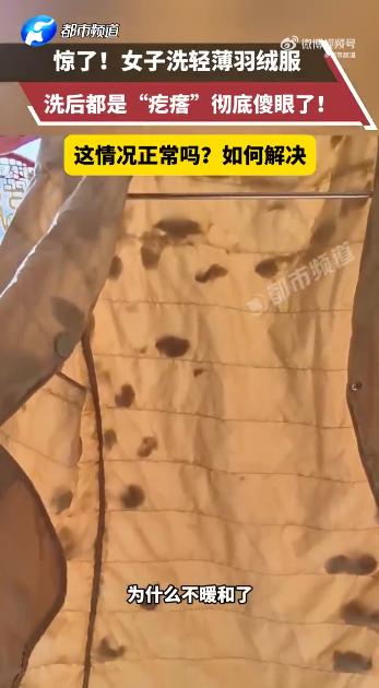 据都市频道,近日,河北一女子将轻薄羽绒服洗完后,发现薄得像纸,一眼看去全是疙瘩,这才知道为什么轻薄羽绒服不暖和。