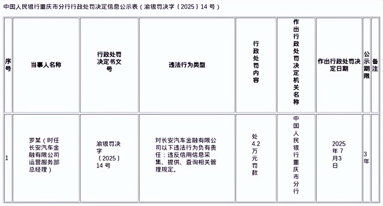 今年7月,中国人民银行重庆市分行的行政处罚决定显示,长安汽车金融因“违反信用信息采集、提供、查询相关管理规定”被重罚,时任运营服务部总经理及相关岗位工作人员同时被追责。