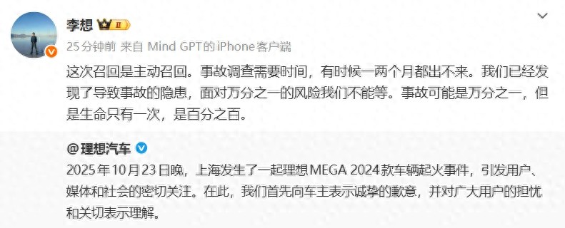 理想汽车CEO李想则表示,“这次召回是主动召回。事故调查需要时间,有时候一两个月都出不来。我们已经发现了导致事故的隐患,面对万分之一的风险我们不能等。事故可能是万分之一,但是生命只有一次,是百分之百。”