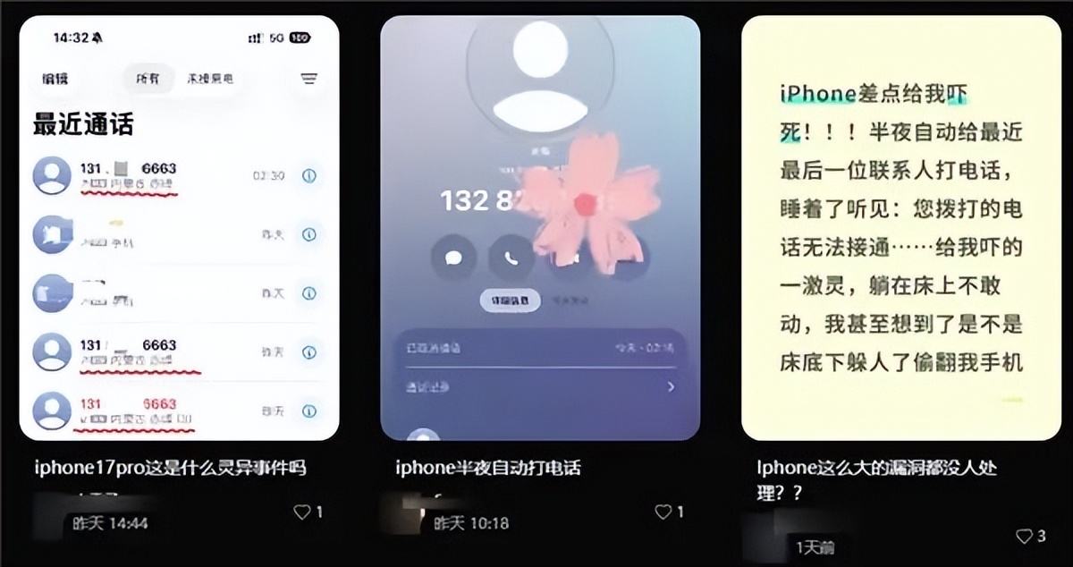 还有用户吐槽称,“iPhone半夜自动给最近最后一位联系人打电话,睡着了听见:您拨打的电话无法接通……给我吓得一激灵,躺在床上不敢动,甚至想到了是不是床底下躲人了偷翻我手机。”
