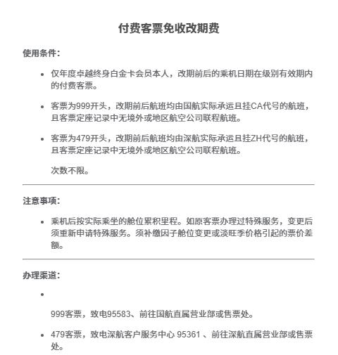 国航官网显示,凤凰知音包括银卡、金卡、白金卡、终身白金卡及卓越白金卡权益,卓越白金卡包含升级券、国际国内航班头等舱升舱券、付费客票免收改期费等权益。根据规定,付费客票免收改期费,仅年度卓越终身白金卡会员本人,改期前后的乘机日期在级别有效期内的付费客票,使用次数不限,须补缴因子舱位变更或淡旺季价格引起的票价差额。