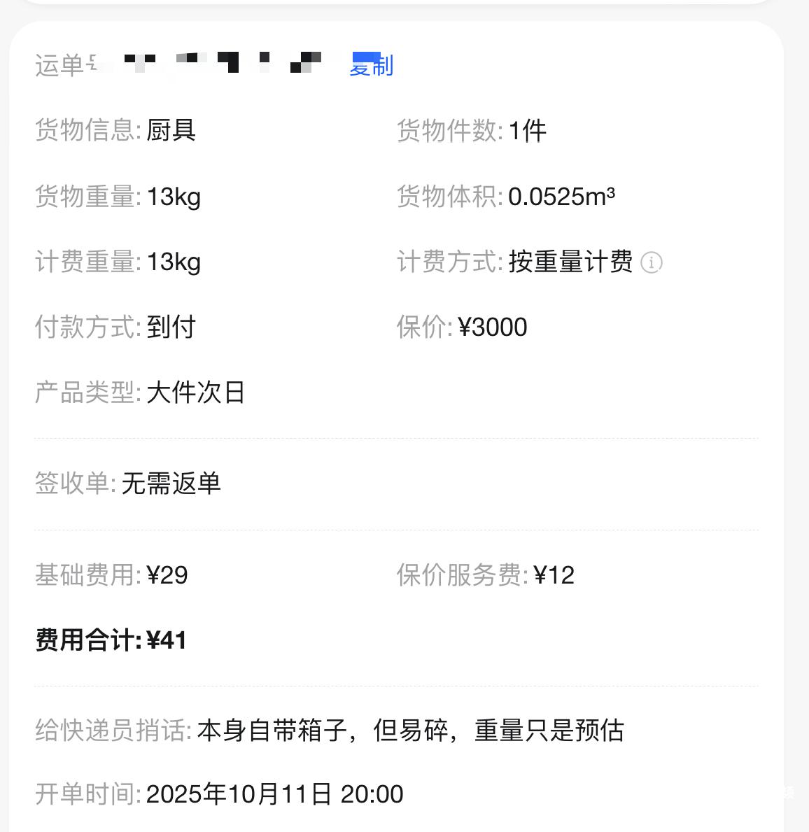 据李女士介绍,她于2025年10月11日通过德邦快递从揭阳市寄出一套潮州骨瓷餐厨具至深圳市。寄件时她已明确告知快递员物品易碎,要求加强泡沫防护,并专门为物品保价3000元,运单电子存根显示,该订单费用除基础费用29元外,还额外包含有12元的保价服务费,共计41元。