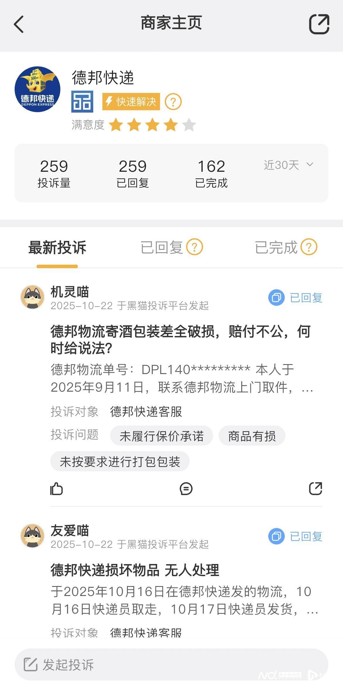 而在黑猫投诉平台,近30天内针对德邦快递的投诉就多达259条,投诉内容主要集中在丢件、处理不及时,以及货物破损后拒绝赔偿等问题。此外,涉及保价纠纷的投诉同样不在少数。