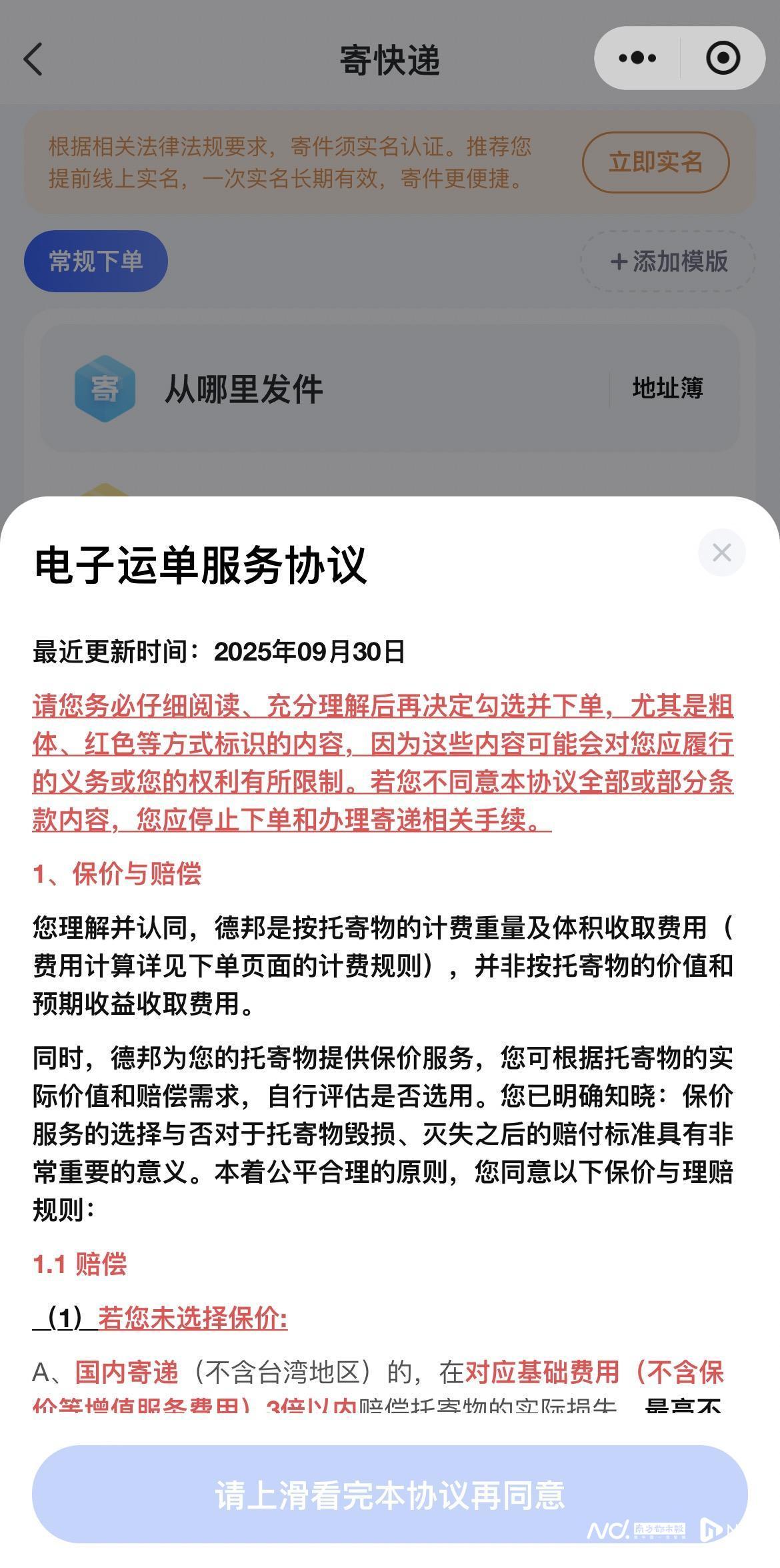 这些频繁出现的理赔争议,实际上与用户在寄件时必须接受的格式条款密切相关。奥一新闻记者注意到,在使用德邦快递小程序寄件前,用户必须勾选同意《电子运单服务协议》(下称“协议”),否则无法完成下单。