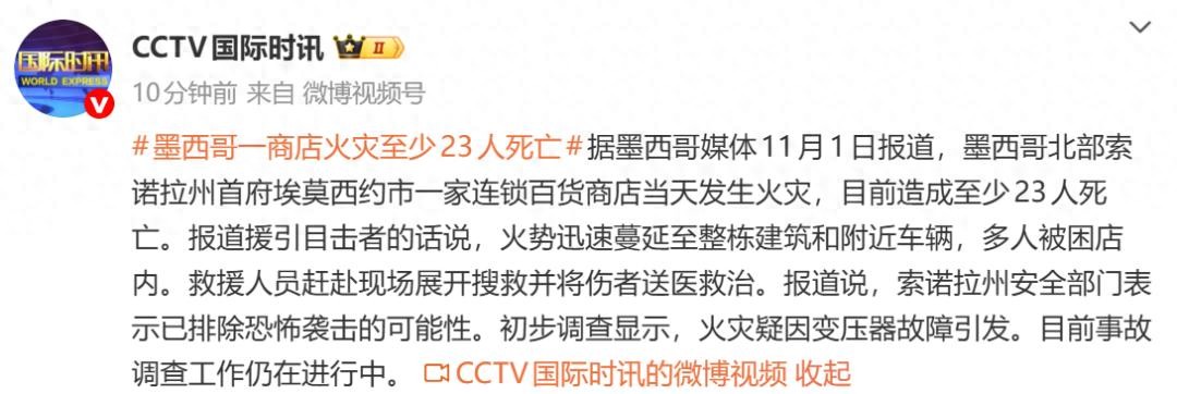 据CCTV国际时讯援引墨西哥媒体11月1日报道,墨西哥北部索诺拉州首府埃莫西约市一家连锁百货商店当天发生火灾,目前造成至少23人死亡。