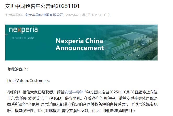 11月2日凌晨,安世半导体中国有限公司在官方微信公众号发布致客户公告函,称荷兰安世半导体目前欠付位于东莞的封装测试工厂(ATGD)的货款高达10亿元人民币。并指出,“目前,安世中国已建立充足的成品与在制品库存,能够稳定、持续地满足广大客户直至年底乃至更长时间的订单需求,供应链安全可靠。为确保供应的长期性与韧性,我们已积极启动多套预案,正在加紧验证新的晶圆产能。我们对在短期内完成验证、并自明年起无缝衔接满足所有客户需求充满信心。”
