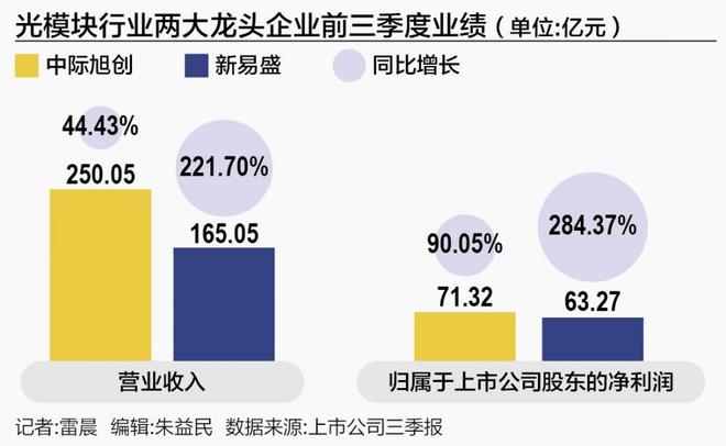 新易盛同样表现不俗,前三季度实现营业收入165.05亿元,同比增长221.70%;归属于上市公司股东的净利润63.27亿元,同比增长284.37%。新易盛的营收增速显著高于中际旭创,展现出更强的增长势头。