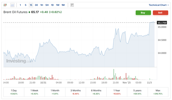 由于市场担心供应过剩,油价在10月20日跌至每桶约60美元的五个月低点,但此后受俄罗斯制裁以及对美国与贸易伙伴谈判的乐观情绪提振,油价回升至每桶约65美元。