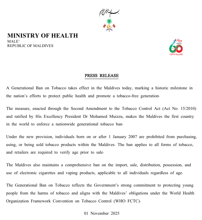 马尔代夫卫生部称,穆罕默德·穆伊兹总统今年早些时候提议颁布“世代禁烟令”,旨在“保护公共健康,培养无烟一代”。
