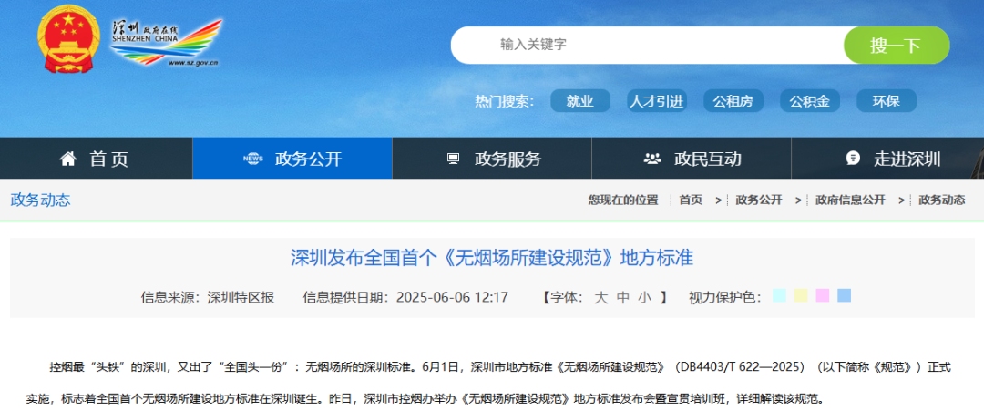 今年6月,深圳市地方标准《无烟场所建设规范》也正式实施,这是全国首个无烟场所建设地方标准。该标准将室内工作场所、室内公共场所、公共交通工具全部列为 “无烟场所”,此外,地铁站出入口、公交站台、为孕妇和儿童提供服务的公园、室外体育场馆都属于无烟场所。