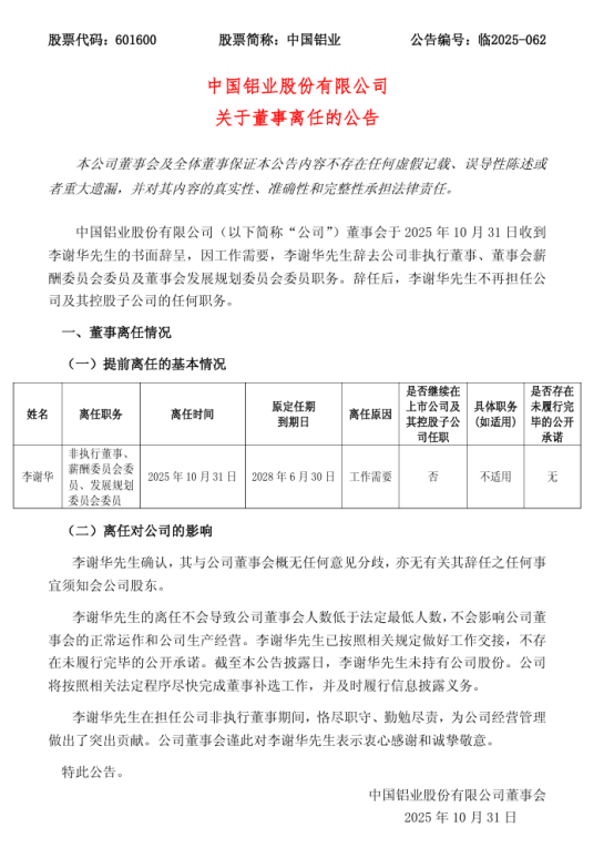 中国铝业发布公告称,公司董事会于10月31日收到李谢华先生的书面辞呈,因工作需要,李谢华先生辞去公司非执行董事、董事会薪酬委员会委员及董事会发展规划委员会委员职务。辞任后,李谢华先生不再担任公司及其控股子公司的任何职务。