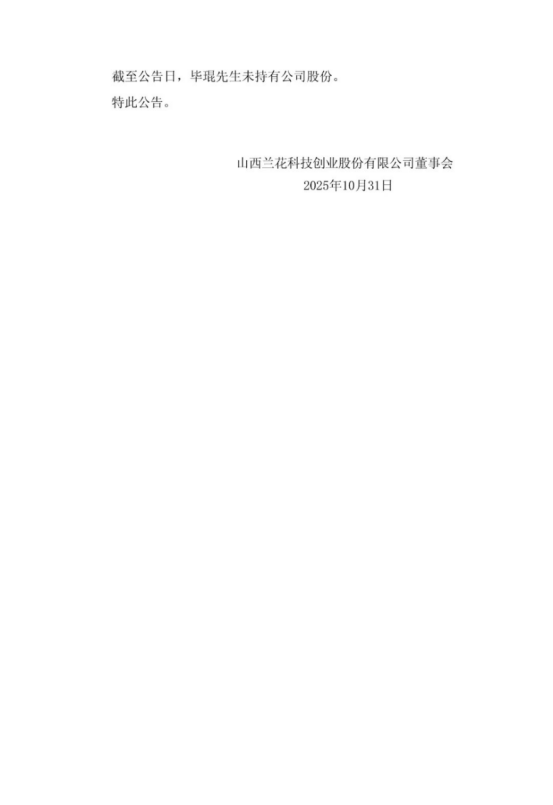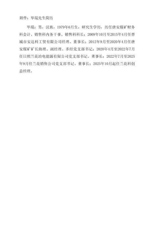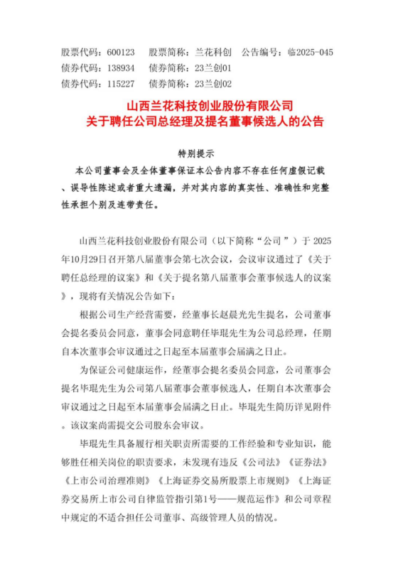 10月31日,兰花科创发布公告称,根据公司生产经营需要,董事会同意聘任毕琨为公司总经理,任期自本次董事会审议通过之日起至本届董事会届满之日止。