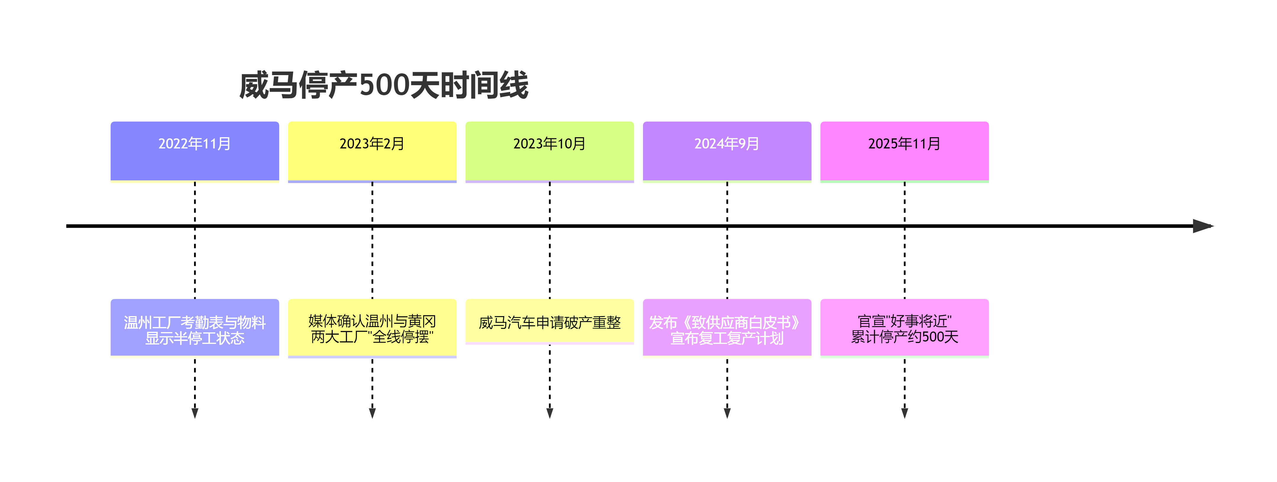 2022年12月,有消息称,由于拖欠供应商货款,威马工厂已陷入停产状态。一位当地人士透露:“现在温州工厂里都没人了。”