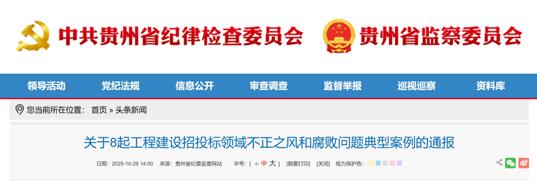 10月29日,贵州省纪委监委公开通报了2025年查处的8起工程建设招投标领域不正之风和腐败问题典型案例。