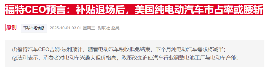 在补贴到期前,多位高管(包括帕克和福特CEO吉姆·法利)已预测电动车销量将出现大幅下滑。法利上月底表示,如果电动车市场份额在补贴结束后从9月的10%至12%跌至约5%,他也“不会感到惊讶”。