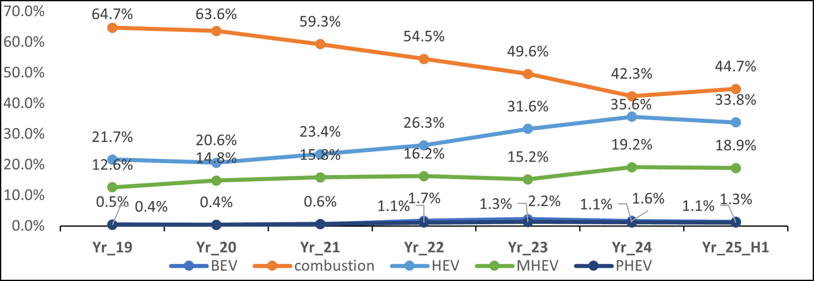 作为全球第四大汽车消费市场,日本的汽车电动化转型进程颇为特殊:油电混合动力汽车(HEV,核心特点是无需外接充电,而是通过发动机运转和动能回收系统为电池充电)在市场中占据绝对主导地位。与之形成对比的是,纯电动汽车在日本的发展进程遭遇瓶颈,渗透率长期处于极低水平。