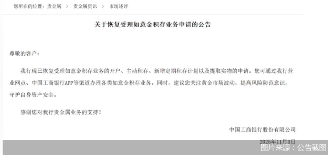 11月3日晚间,工商银行发布公告称,该行现已恢复受理如意金积存业务的开户、主动积存、新增定期积存计划以及提取实物的申请。投资者可通过该行营业网点、中国工商银行App等渠道办理各类如意金积存业务。同时,建议投资者关注黄金市场波动,提高风险防范意识,守护自身资产安全。