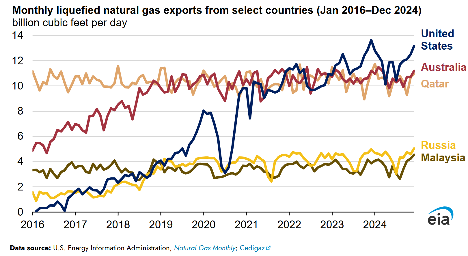 顺便一提,美国本土48州直到2016年初才历史首次出口液化天然气。在页岩气革命推动产能和国际需求爆发的背景下,美国出口量在短短几年里迅速飙升,并超过传统天然气出口大国澳大利亚和卡塔尔。