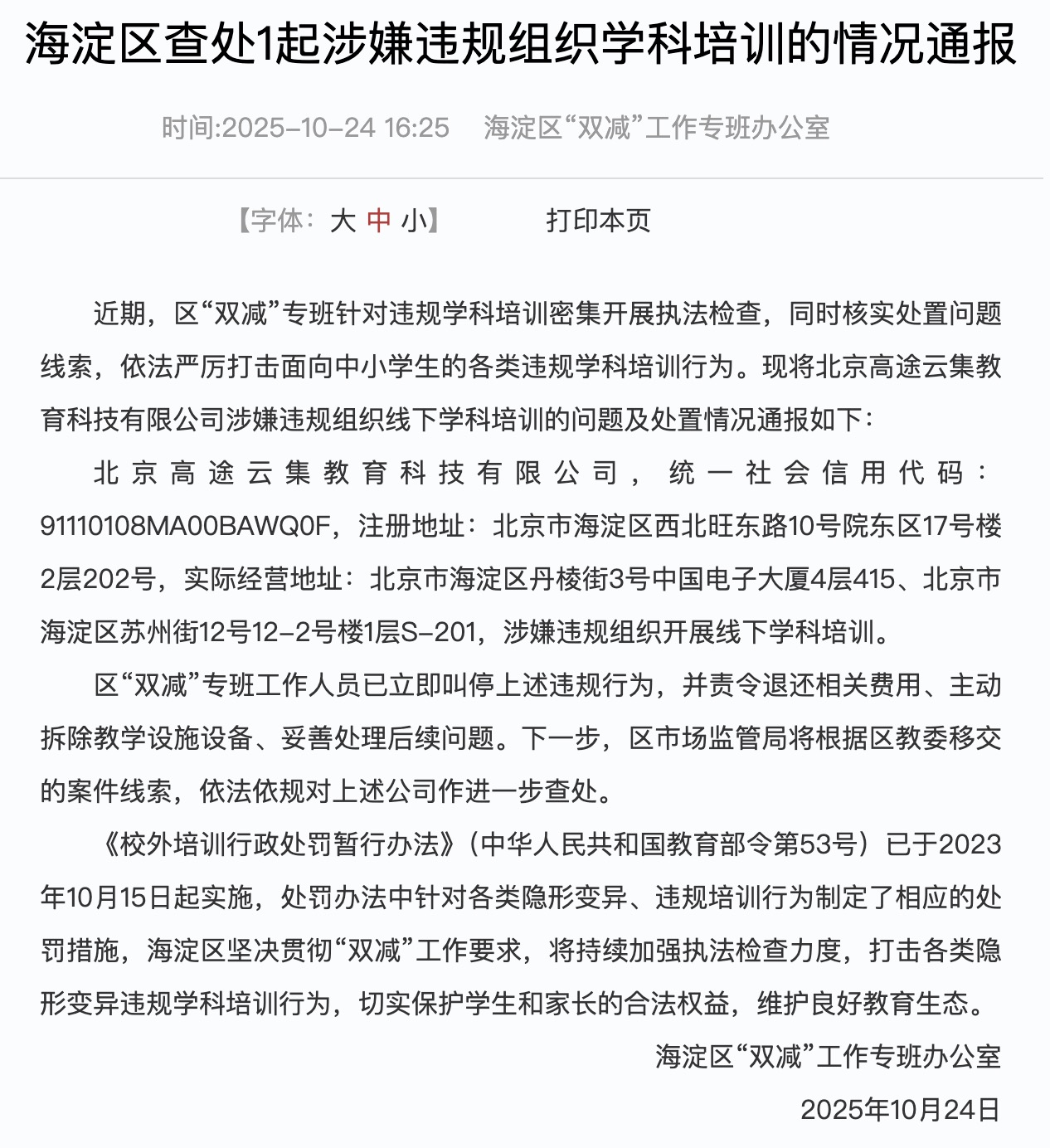 近日,海淀教育官网发布消息,海淀区 “双减” 专班查处北京高途云集教育科技有限公司(统一社会信用代码 91110108MA00BAWQ0F)涉嫌违规组织线下学科培训,并通报相关情况。