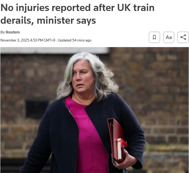 据路透社报道,英国交通大臣海蒂·亚历山大表示,当地时间3日,一列从格拉斯哥开往伦敦的火车在英格兰北部脱轨,暂无人员伤亡报告。