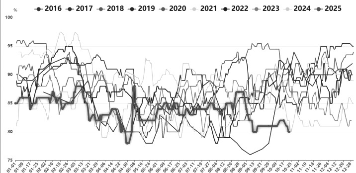 PP检修季主要集中在4—7月份,8月份之后PP开工率明显提升,一度反弹至85%以上。不过进入9月份之后,计划外检修明显增多,PP开工率再次降至85%以下;10月份PP开工率进一步下降,截至10月底,PP开工率已经降至80%,即将触及年内最低点,同时也是历史同期最低点。