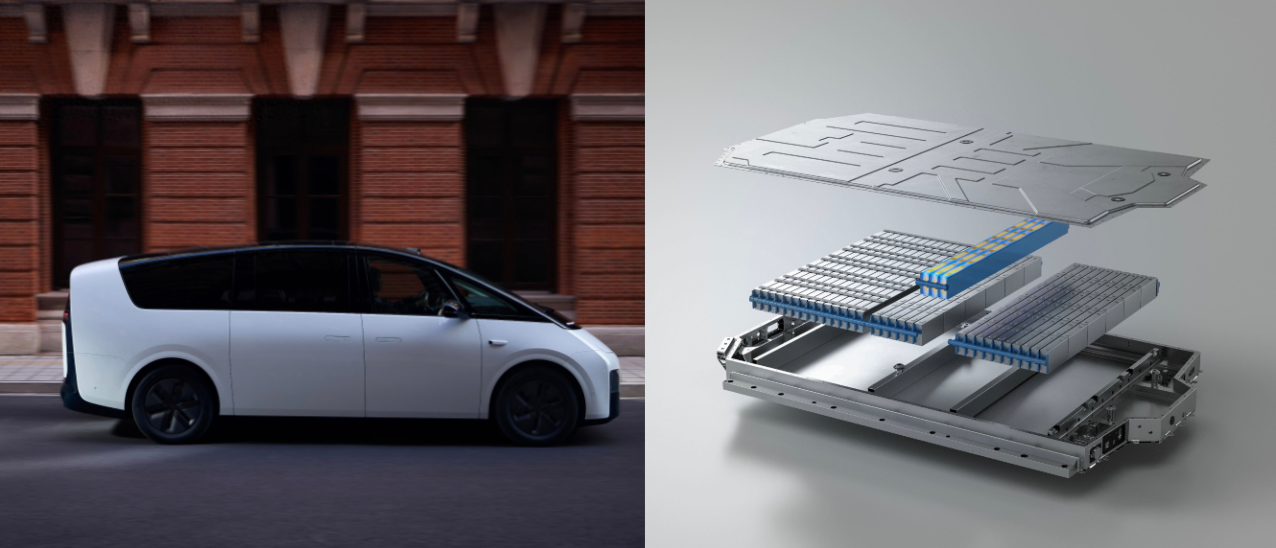 右图为理想MEGA车型,左图为搭载的宁德时代麒麟电池内部示意图。